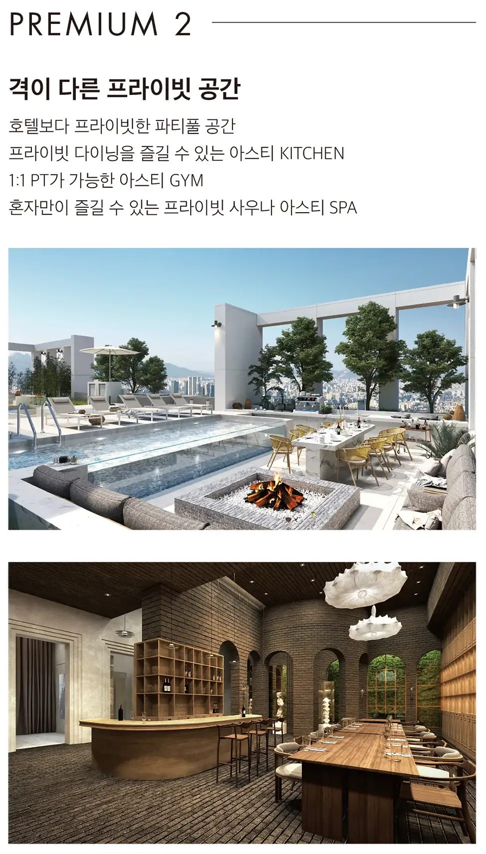 아스티 논현의 또 다른 장점은 입주민만을 위한 프라이빗 커뮤니티 공간입니다. 단지 최상층에는 이국적인 분위기의 루프탑이 마련되어 있어, 입주민들은 이곳에서 프라이빗한 파티를 즐길 수 있습니다. 라꼬르뉴 오븐이 설치된 키친은 홈파티 및 비즈니스 모임에 최적화되어 있습니다.