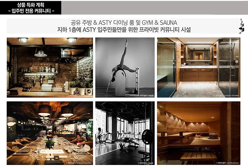 이 외에도 개인 레슨이 가능한 아스티 짐에서는 요가, 필라테스, 스피닝 수업을 받을 수 있으며, 건식 사우나와 개인 욕조가 설치된 스파 공간은 일상의 피로를 해소할 수 있는 최적의 환경을 제공합니다.
