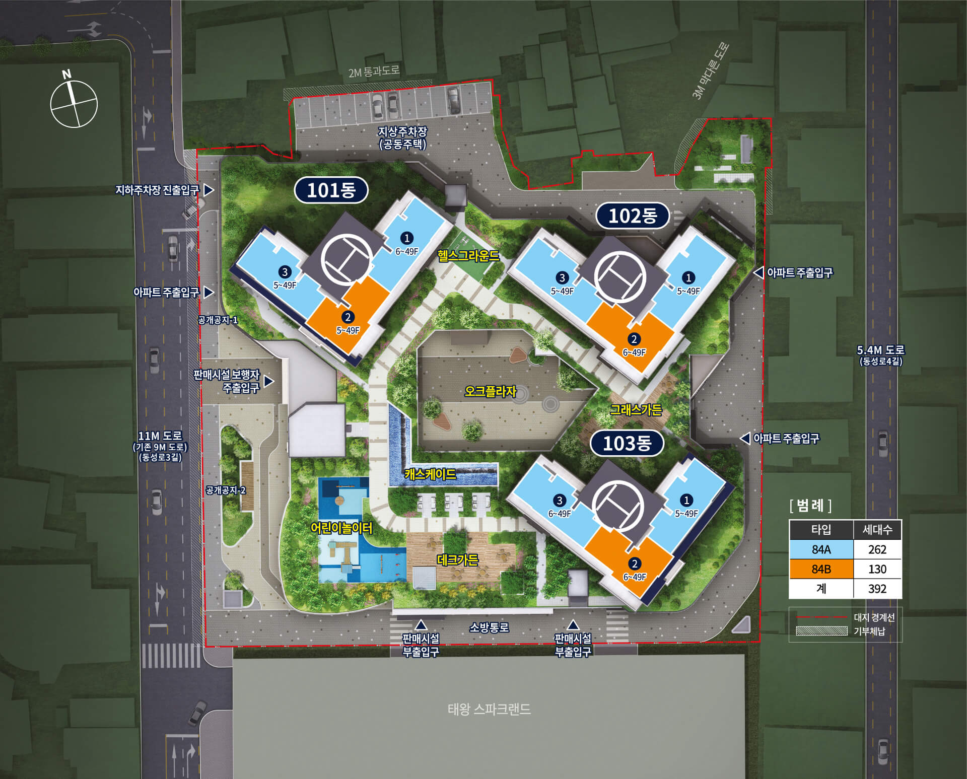 세대 수는 총 392세대. 주상복합이지만 단지 중심에는 ‘오크 플라자’, ‘그래스 가든’, ‘캐스케이드 쉼터’ 같은 자연 친화 조경을 마련했습니다. 도심에 살면서도 힐링이 가능한 주거환경을 갖췄다는 점에서 차별점이 확실합니다.