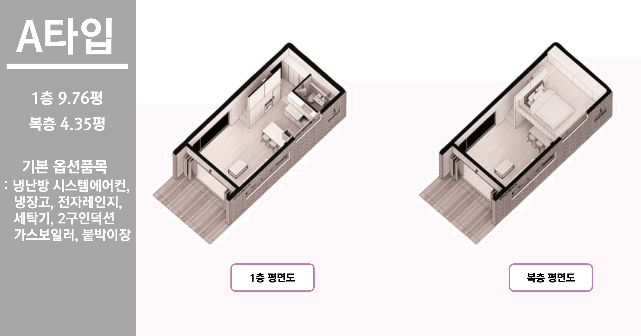 A타입은 1층 9.76평과 복층 4.35평으로 구성된 구조입니다. 냉난방 시스템에어컨, 냉장고, 전자레인지, 세탁기, 2구인덕션, 가스보일러, 붙박이장으로 구성되어 있습니다.
