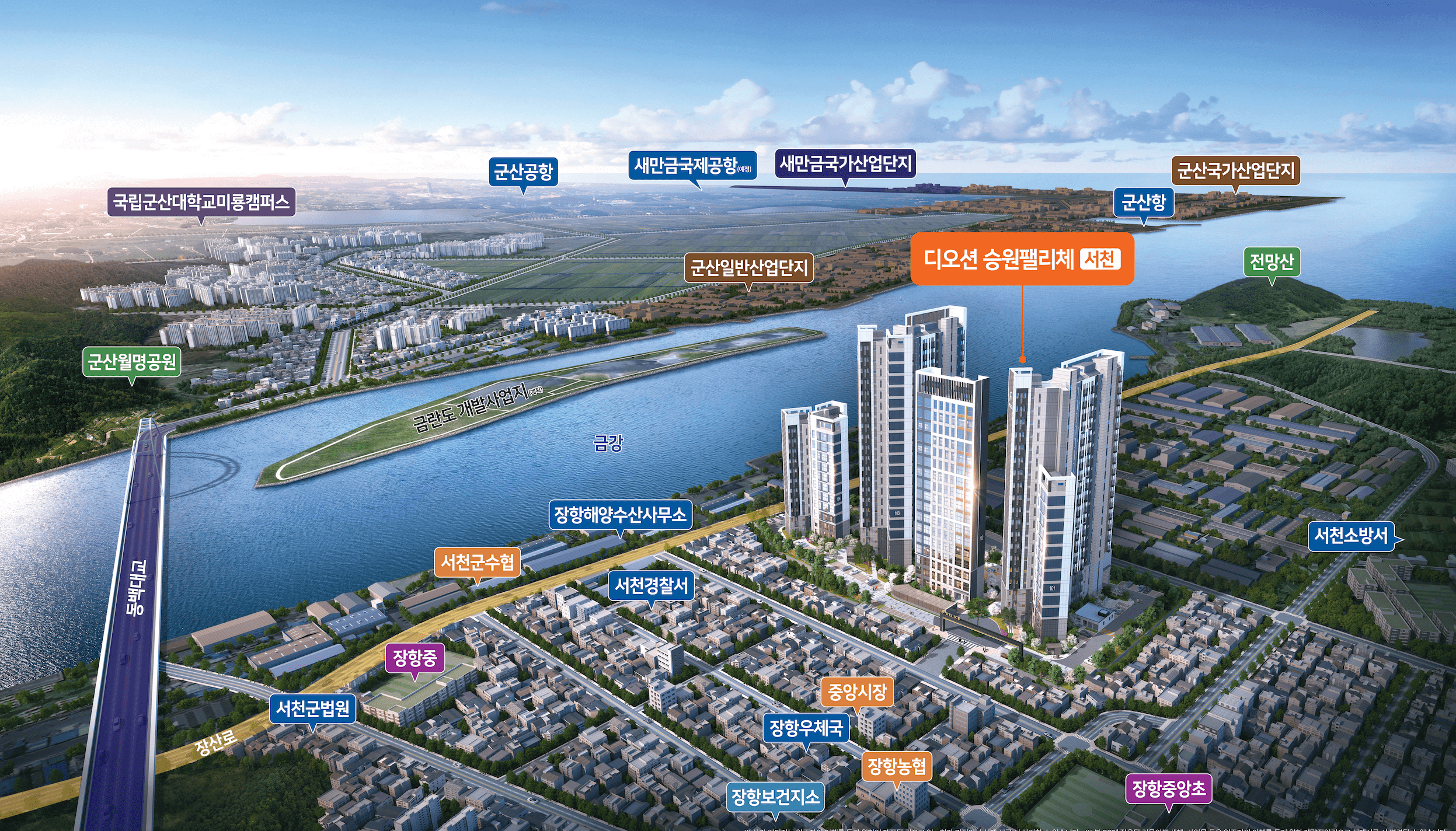 디오션 승원팰리체 서천은 충남 서천군 장항읍에 위치하며, 군산과 서천을 잇는 동백대교와 가까워 뛰어난 교통 접근성을 자랑합니다. 이 전략적 입지는 서천-군산 생활권을 동시에 누릴 수 있는 기회를 제공합니다.