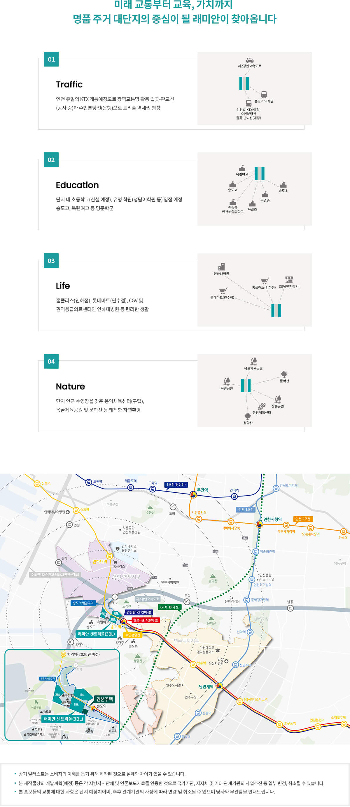 래미안 송도역 센트리폴은 인천의 주요 광역교통망과의 접근성이 뛰어난 위치에 있습니다. 도보 6분 거리에는 수인분당선 송도역이 있으며, KTX 인천발 노선, 월곶판교선, 송도-강릉 경강선 등의 다양한 교통망이 확장될 예정입니다. 이와 더불어 영동고속도로와 제2경인고속도로와의 접근성이 좋아 자차 이동에도 유리합니다.