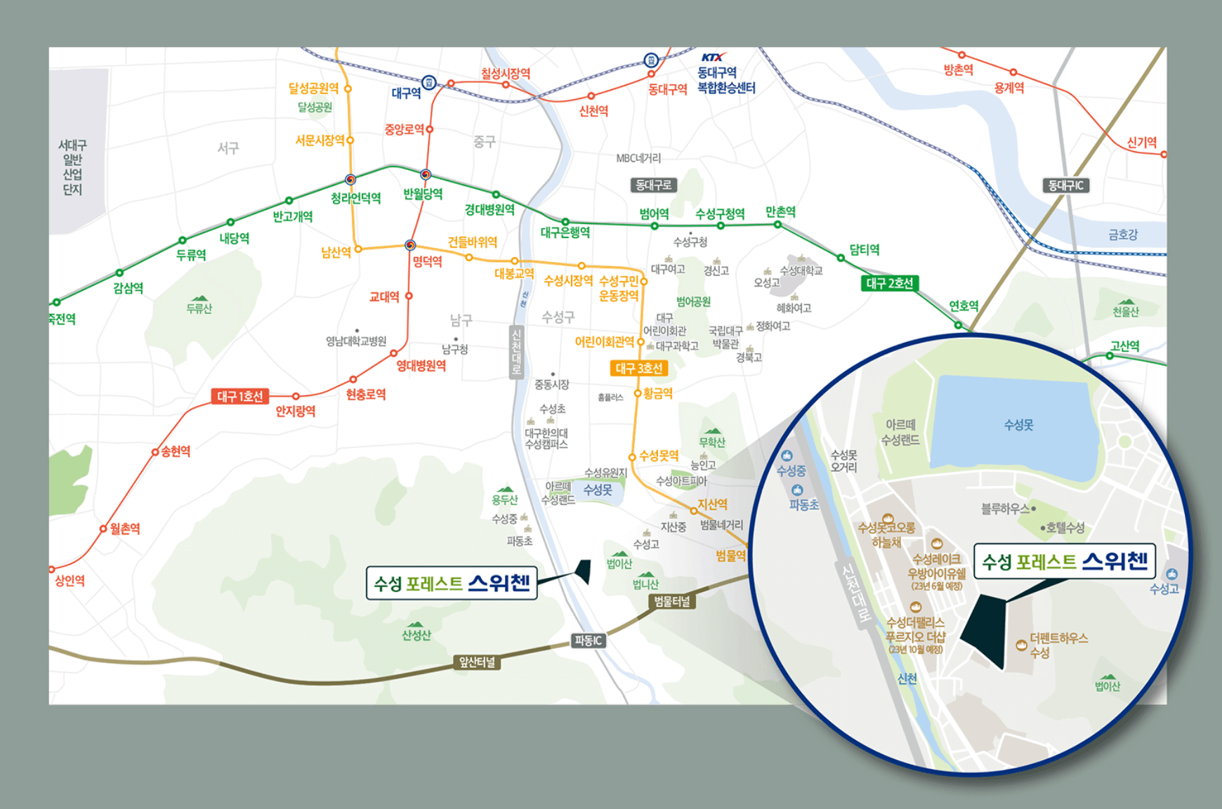 '수성 포레스트 스위첸'은 대구의 중심부인 수성구에 위치해 있어도 수성못, 법이산, 앞산 등 산과 물 푸른 숲의 전망을 품은 특급자연환경을 누릴 수 있습니다. 차량을 통해 신천대로를 이용하면 수성구 중심부로 접근이 용이합니다. 생활권은 수성구 중심에 두고 희소한 에코라이프까지 누릴 수 있습니다.