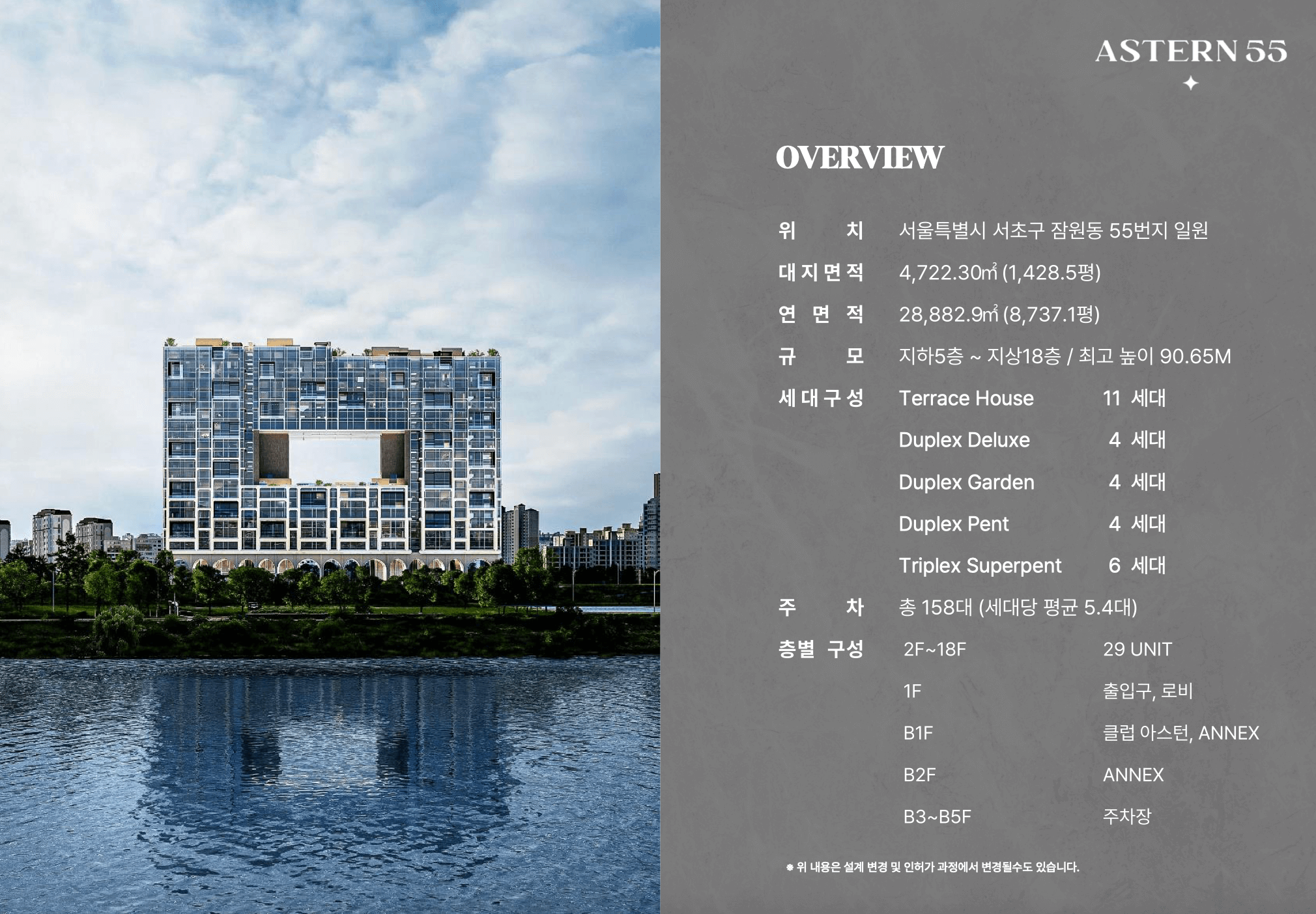 아스턴55는 서초구 잠원동 55번지 일대에 조성된 지하 5층~지상 18층 규모의 하이엔드 공동주택으로, 단 29세대만으로 구성된 초프라이빗 레지던스입니다. 입지부터 특별하지만, 공간 설계는 더욱 감탄스러웠습니다.