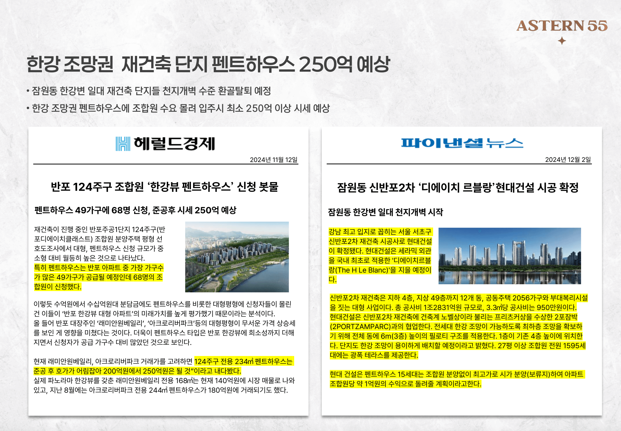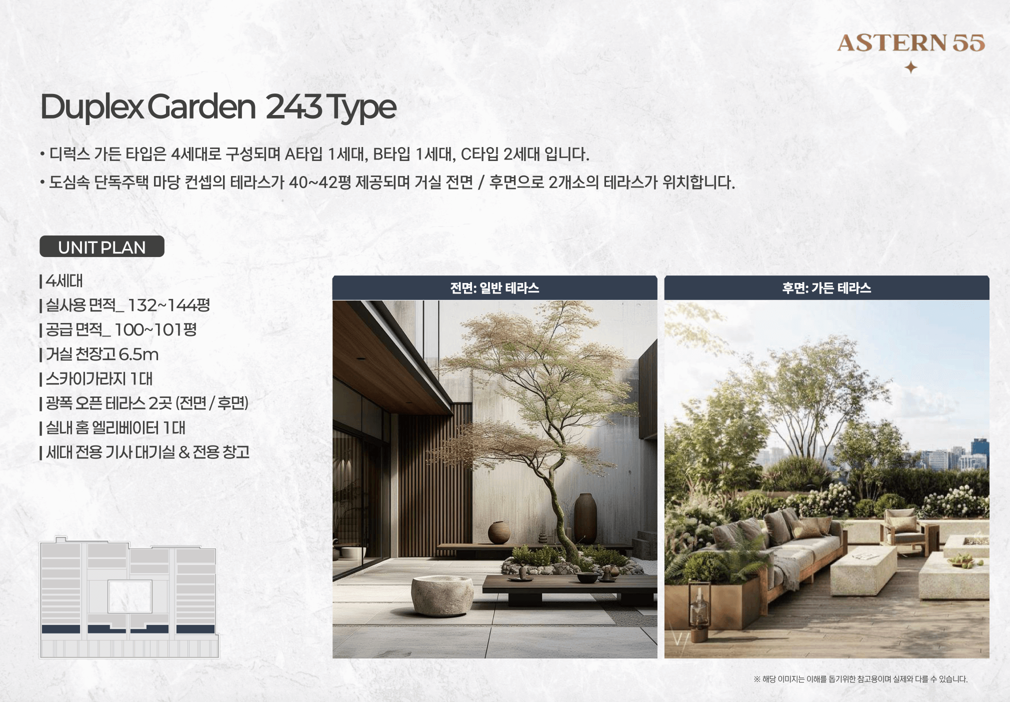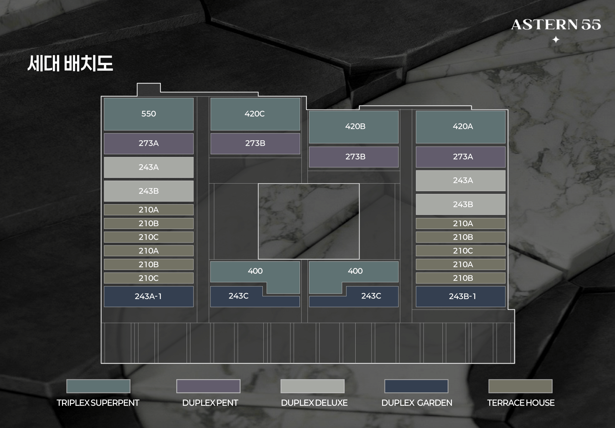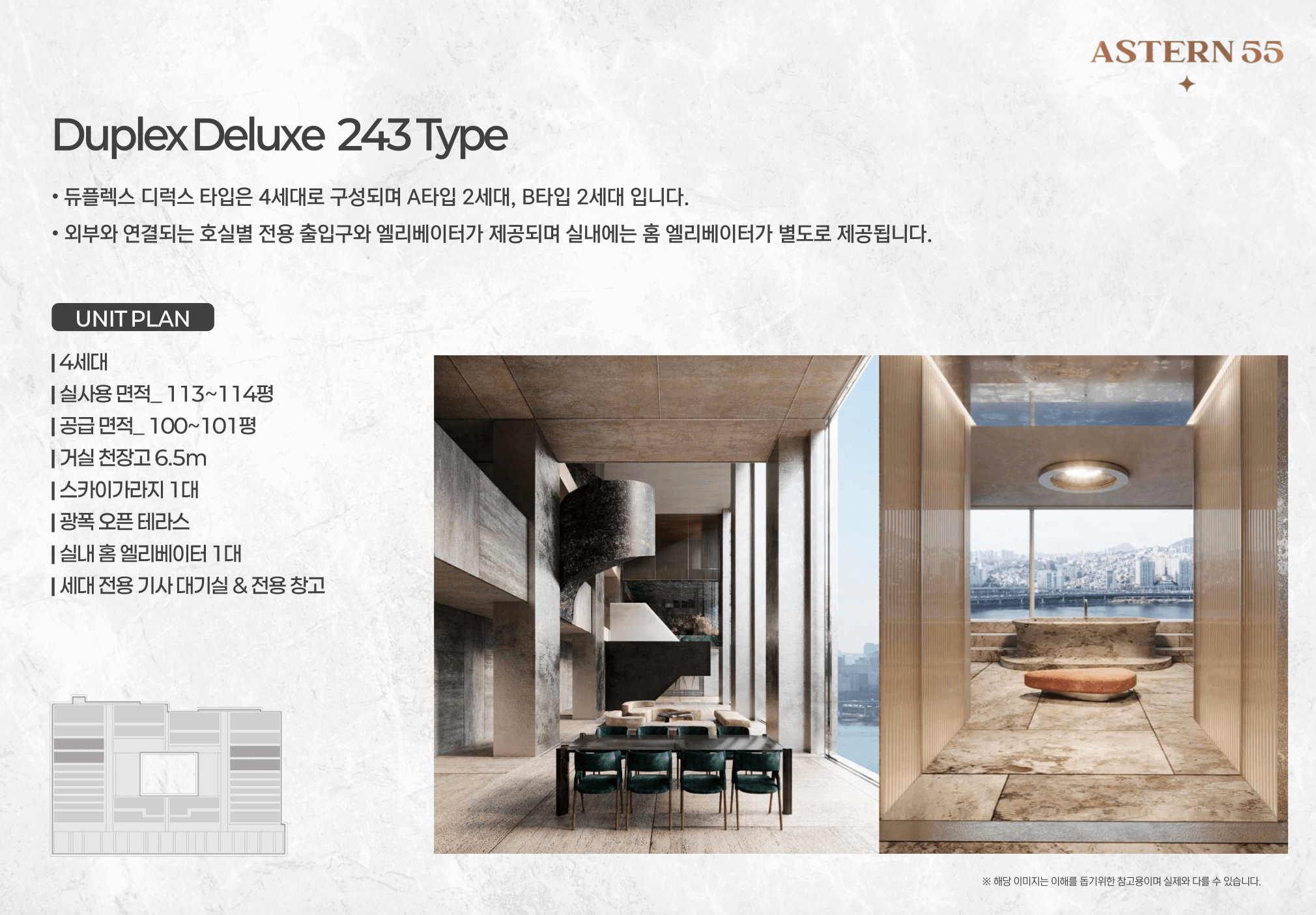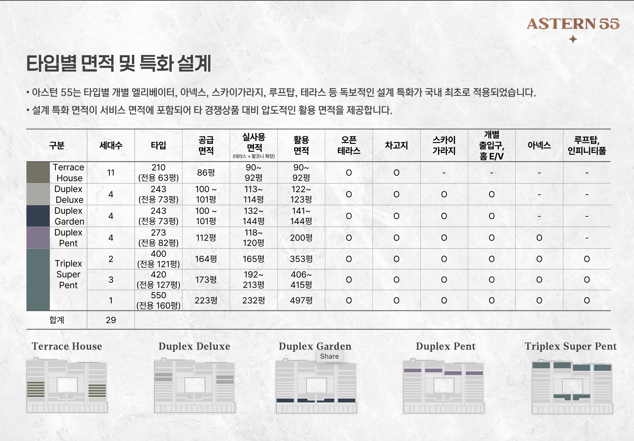 실제 아스턴55의 분양가는 100억대 후반에서 700억대 후반까지 형성되어 있으며, 유니트별로 세부 사양과 희소성이 반영된 맞춤형 가격 구조를 갖추고 있었습니다. 특히 3세대 한정으로 공급된 슈퍼펜트 유닛은 그 자체로 자산 가치가 탁월해 보였습니다.