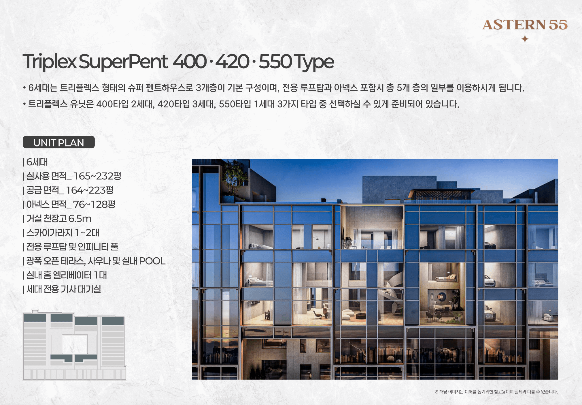 - 개별 수영장, 사우나, 스카이가라지 등 포함된 슈퍼펜트 유닛