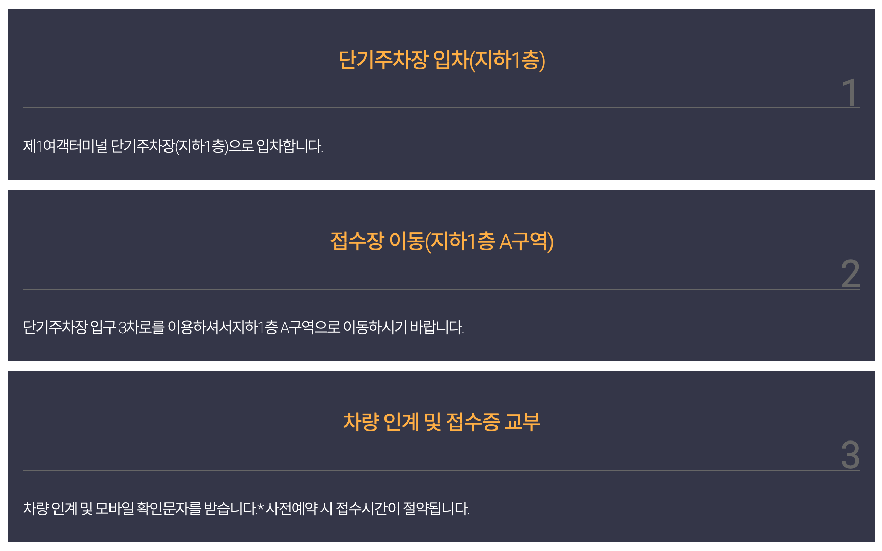 - 주차대행 접수장 위치: 제1여객터미널 단기주차장 지하1층 A구역