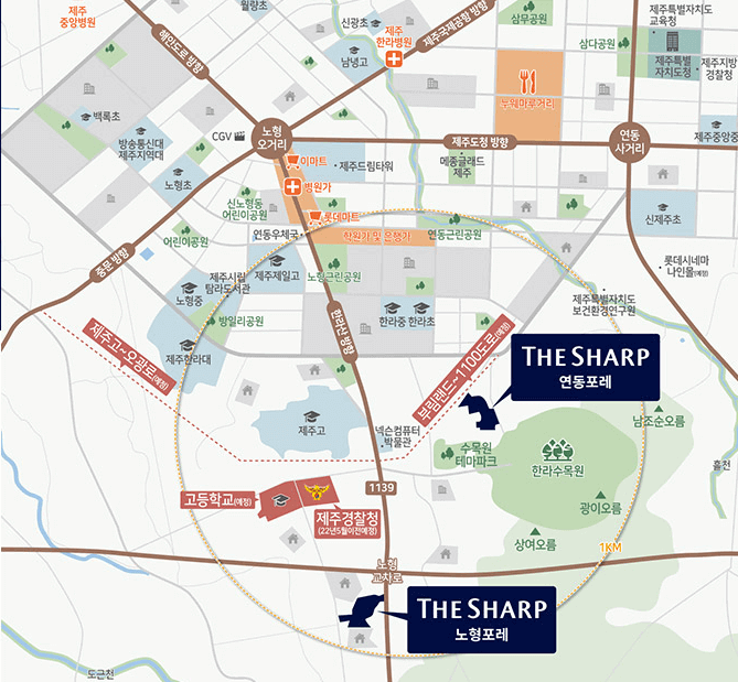 뿐만 아니라, 이 두 단지는 제주국제공항과 제주항에서 가까워 편리한 교통 접근성을 갖추고 있으며, 부림랜드~1100도로, 제주고~오광로, 1139도로 등을 통해 제주 전역으로의 빠른 이동이 가능합니다. 이외에도 CGV, 이마트, 롯데마트와 같은 다양한 편의시설과 행정기관, 대형 의료시설이 인근에 위치해 생활의 편리함을 더합니다.