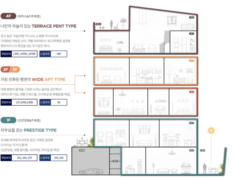 특히 더샵연동포레의 1층 타입은 지하 1층 공간을 연계한 복층형 설계를 통해 바비큐, 홈가드닝이 가능한 선큰 정원을 마련해, 지하 공간에서도 자연 채광과 통풍을 즐길 수 있습니다. 더샵노형포레의 4층 타입은 개별 야외 테라스와 다락 복층 설계로 펜트하우스 수준의 주거 공간을 제공합니다. 이와 같은 차별화된 설계는 더샵연동포레와 더샵노형포레를 제주에서 가장 진화된 주거 공간으로 만듭니다.
