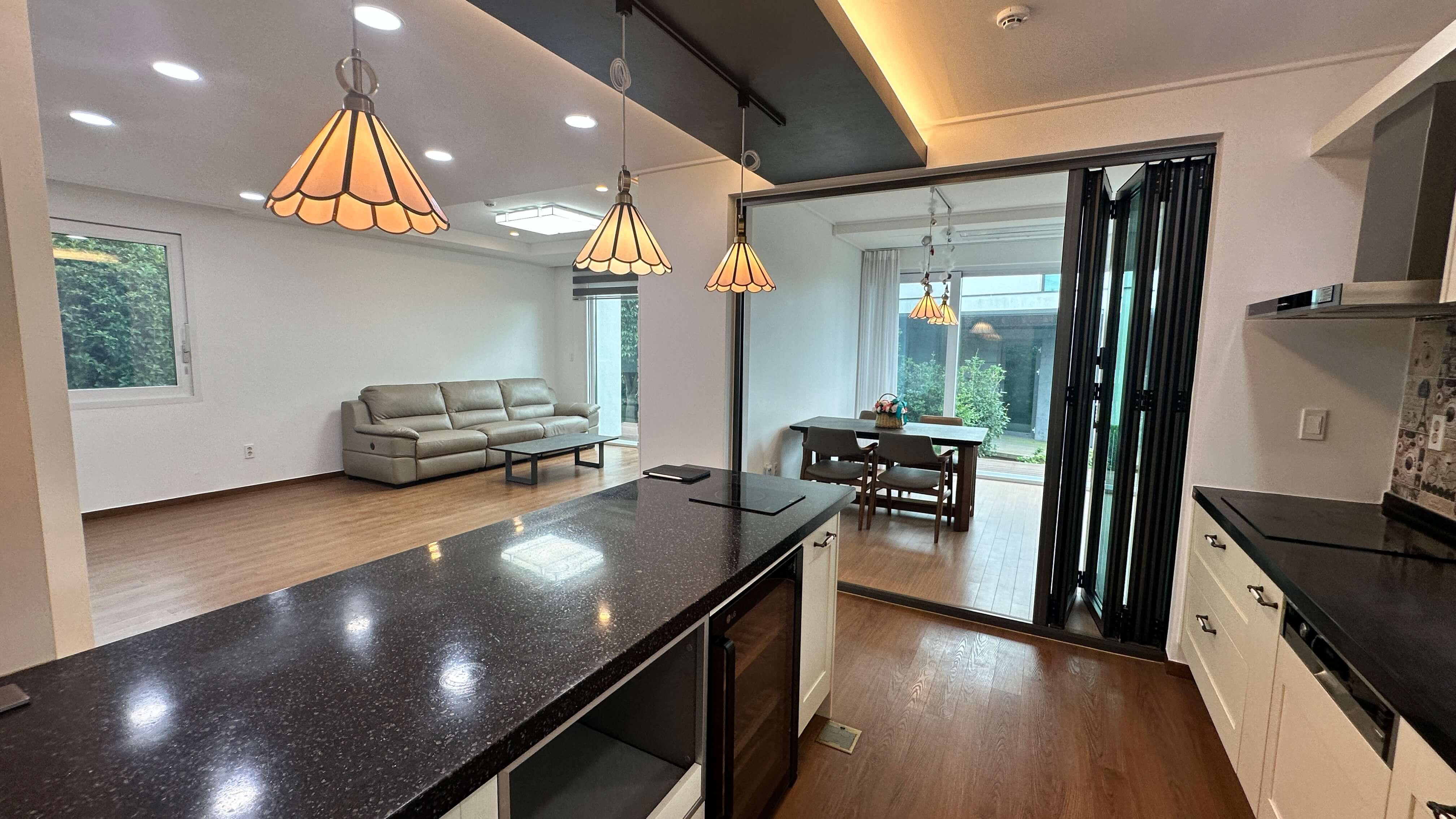 거실은 2.4m 높이의 이건 시스템 창호를 사용하여 탁 트인 개방감을 주며, LED 조명과 간접등이 설치되어 있어 밝고 세련된 분위기를 연출합니다. 주방은 11자 구조로 설계되어 조리와 수납이 용이하며, 빌트인 가전이 설치되어 있어 깔끔하고 효율적인 공간 활용이 가능합니다.