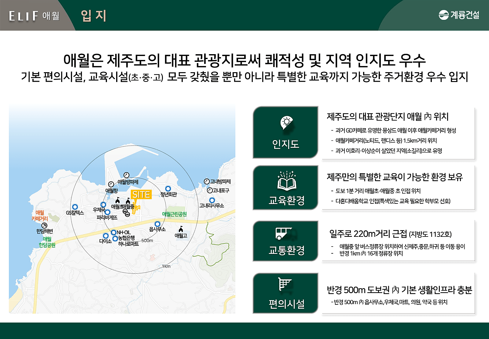 건설사는 단순한 브랜드가 아닙니다. 입주 후의 생활 수준을 결정짓는 핵심 요소입니다. 엘리프 애월의 시공사는 계룡건설 ELIF입니다.