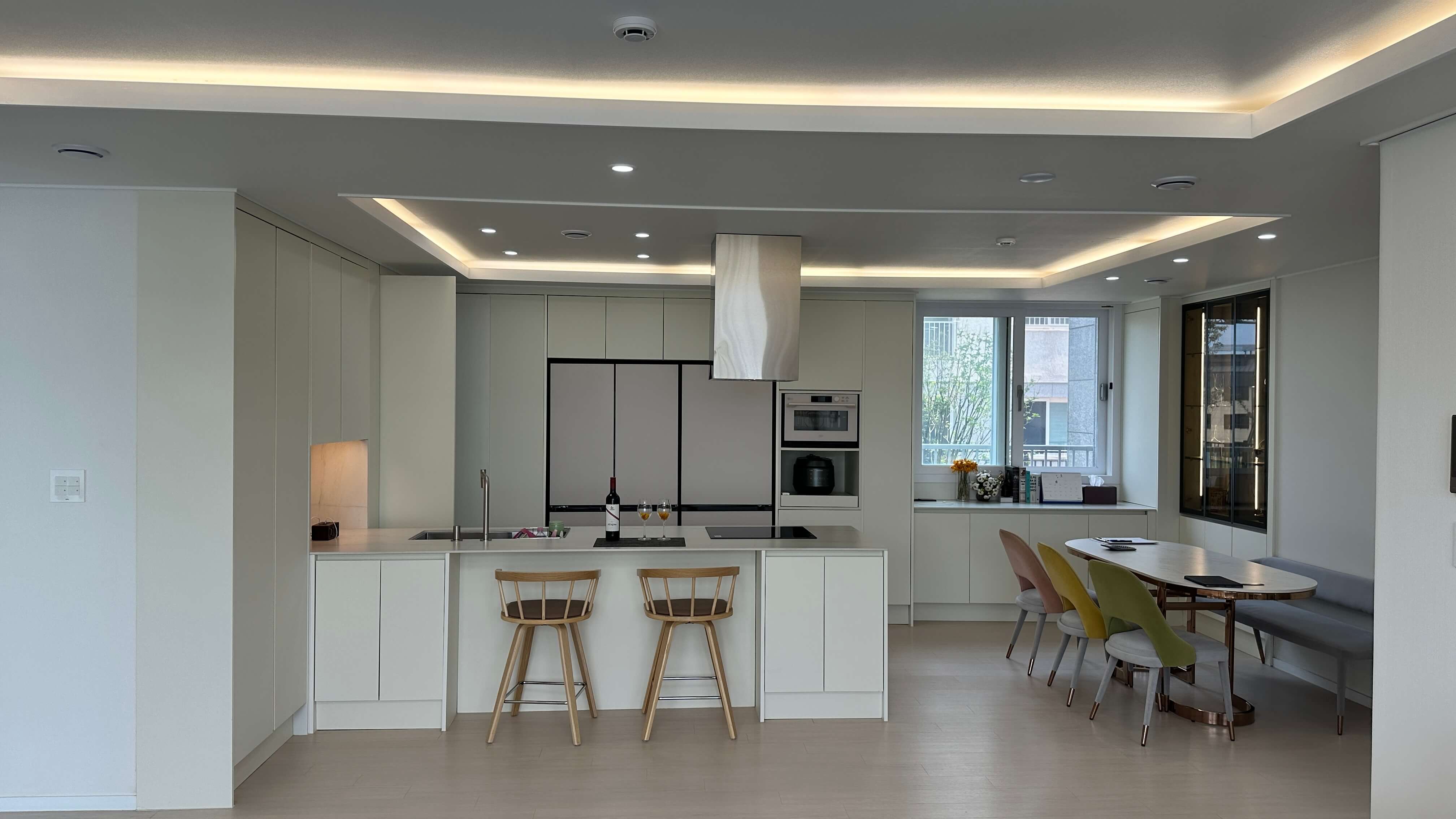 주방은 대면형 구조로 설계되었으며, 아일랜드장과 하부장, 상부장 모두 효율적인 수납이 가능하도록 시공되어 주부의 동선과 실용성을 모두 고려했습니다. 또한 주방 옆 다용도실에는 싱크대와 2구 가스레인지가 기본 제공되어 보조 주방으로도 활용 가능합니다.